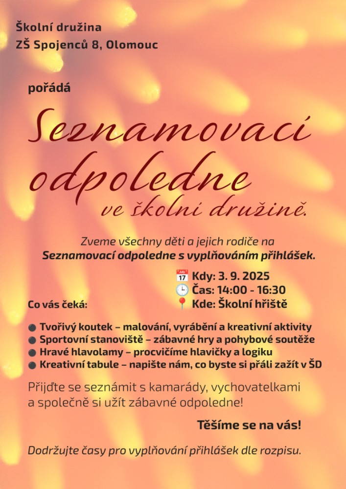 🌟Milí rodiče, srdečně Vás i děti zveme na seznamovací odpoledne ve školní družině. Více informací naleznete v přiloženém letáčku.🌟